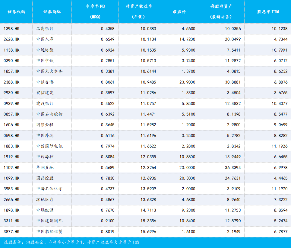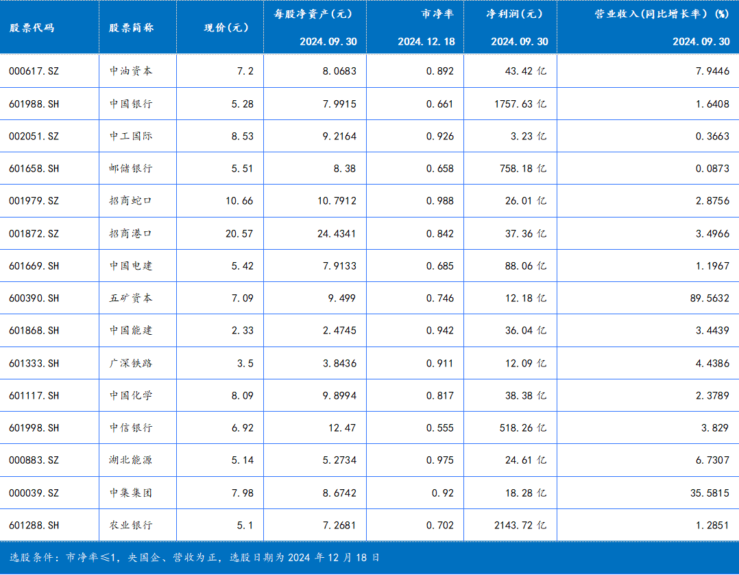 结合前文的表述,在上市的央企控股企业中,寻找每股净资产>股票现价,且盈利能力为正的上市公司标的,是一种较为功利,且符合政策的选股模型。从政策视角来说,国资委的市值管理政策有望督促这类股票率先获得估值修复机会。只是从A股视角来看,这类股票的数量并不算多。
