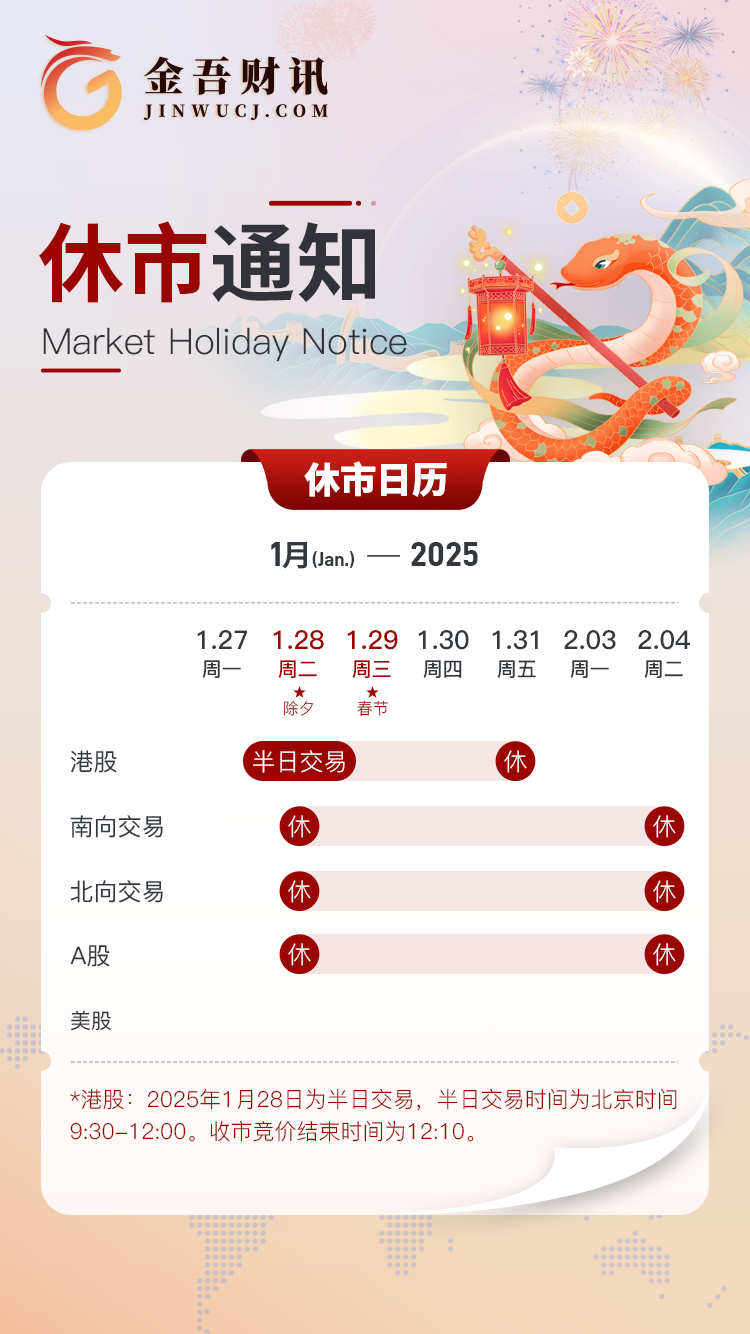 港股:1月28日(除夕,周二)半日交易,1月29日(春节,周三)-1月31日(年初三,周五)休市,2月3日(年初六,周一)-2月4日(年初七,周二)如常开市。