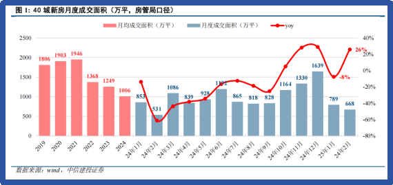 根据中信建投研报数据显示,2025年1-2月,全国重点40城新房累计成交面积为1456万平,同比增长5%,2月单月成交面积达到668万平方米,同比增长26%。考虑到2024年春节假期位于2月,因此今年2月的同比增速表现较为亮眼,但整体来说,25年春节过后的新房成交延续了2024年四季度以来的止跌回稳趋势。