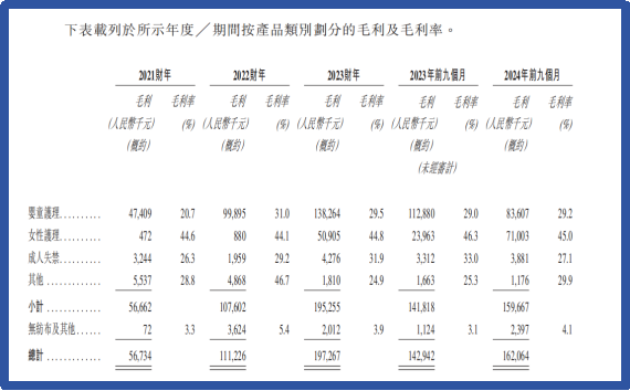 拆分毛利来看,公司目前的毛利增量主要由女性护理产品推动。截至2024年9月,公司女性护理产品的毛利率达到45%,而同期婴童护理产品的毛利率仅有29.2%。这也导致公司女性护理产品直接贡献的毛利较高,占总毛利比重的43.8%,仅次于婴童护理的51.6%,两者之间的差距显著小于两者的收入占比。