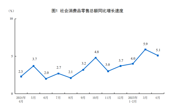 金吾财讯 | 5月19日,国家统计局公布2025年4月份社会消费品零售数据。其中以旧换新相关商品增长较快。4月,社会消费品零售总额37174亿元,同比增长5.1%,略低于预期的5.5%。其中,除汽车以外的消费品零售额33548亿元,增长5.6%。