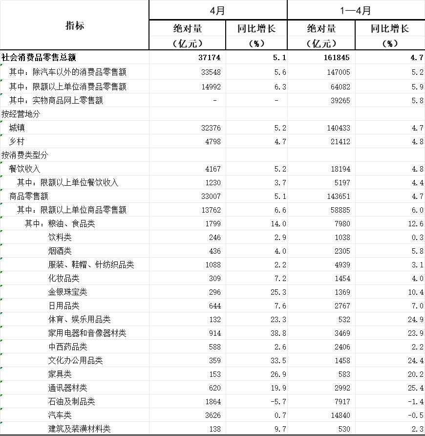 首4月,社会消费品零售总额161845亿元,增长4.7%。其中,除汽车以外的消费品零售额147005亿元,增长5.2%。