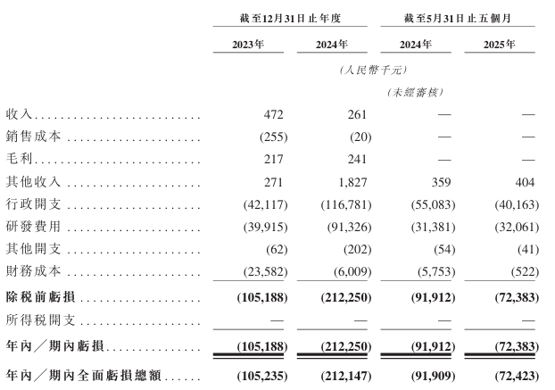 2023-2024年分别录得收入亏损1.05亿元、2.12亿元。2025年首5月,亏损同比减少21.25%至7238.3万元。