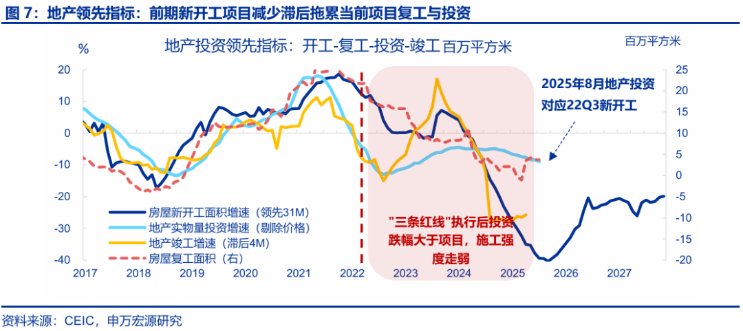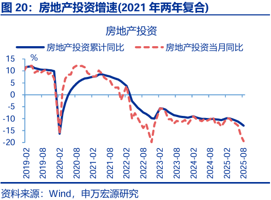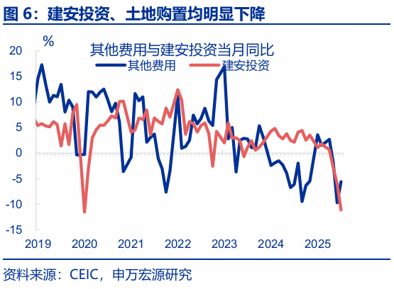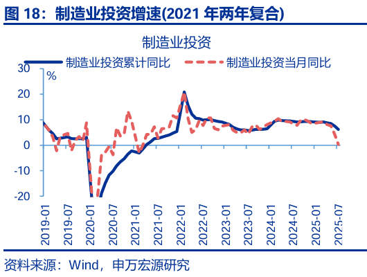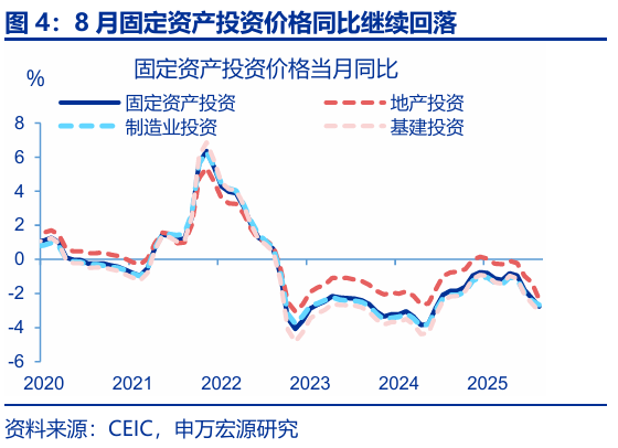 投资:8月固定投资继续下行,主因“反内卷”对中下游投资影响开始显现,叠加前期新开工持续收缩对当前地产投资的拖累加深。8月固定投资当月同比回落1.0pct至-6.3%,剔除价格后实际增速回落0.8pct至-4%;从投资类型看,8月其他费用(+4.1pct至-5.6%)、设备购置(+3.8pct至9.9%)投资增速均小幅反弹,但建安投资大幅下行(-5pct至-11.1%);分投资主体看,地产投资回落幅度最大(-2.4pct至-19.4%),与我们地产领先指标基本吻合;制造业投资(-0.9pct至-1.2%)也明显下行,虽然上游投资增速基本持平,但中下游如运输设备(-36pct至7%)、汽车(-9.2pct至9.7%)等行业投资下滑幅度更大,显示“反内卷”的政策影响开始显现;基建投资也出现明显回落,主要受到公用事业投资(-8.1pct至4.3%)明显降速的影响,狭义基建(-0.5pct至-5.8%)也偏弱。