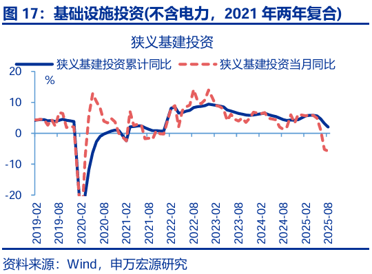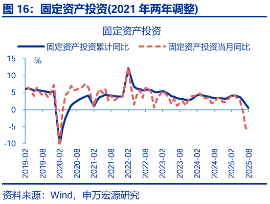 投资:固定资产投资进一步下探,狭义基建投资延续负增。8月,固定资产投资累计同比回落1.1个百分点至0.5%、不及市场预期(1.3%,WIND),调整后的固定资产投资当月同比为-6.3%、较7月回落1个百分点;其中,狭义基建投资当月同比较7月回落0.5个百分点至-5.8%。
