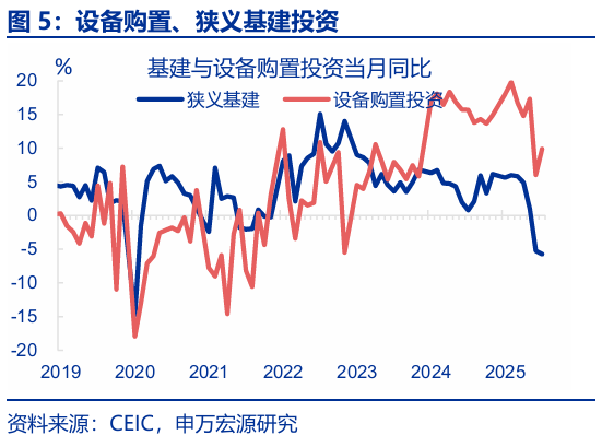 投资:8月固定投资继续下行,主因“反内卷”对中下游投资影响开始显现,叠加前期新开工持续收缩对当前地产投资的拖累加深。8月固定投资当月同比回落1.0pct至-6.3%;建安投资大幅下行(-5pct至-11.1%)构成主要拖累;分投资主体看,地产投资回落幅度最大(-2.4pct至-19.4%);制造业投资(-0.9pct至-1.2%)也明显下行,主因中下游如运输设备、汽车等行业大幅下滑;基建投资受公用事业拖累也出现明显回落。