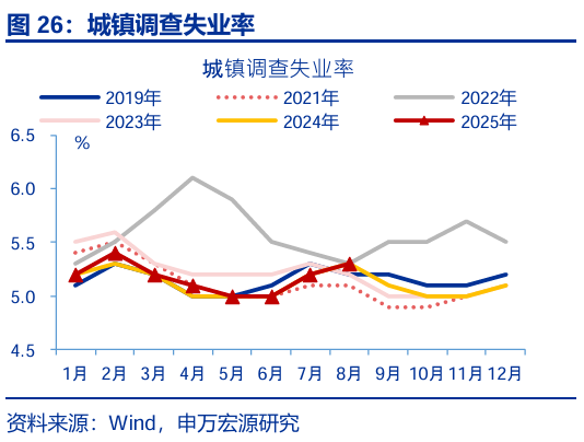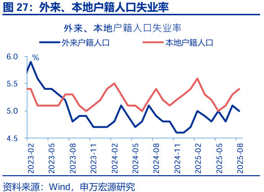 就业:城镇调查失业率小幅回升,整体符合季节性。8月,城镇调查失业率5.3%,较前月上行0.1pct,与过往6年均值持平。其中,本地户籍(5.4%)人口失业率较前月回升0.1pct,外来户籍(5.0%)较前月回落0.1pct。