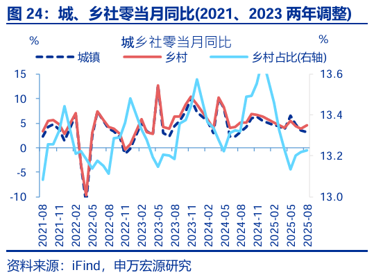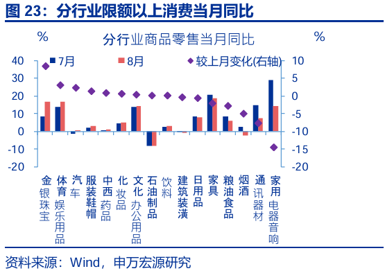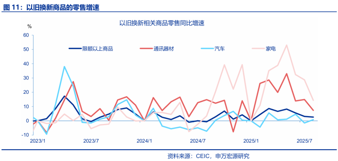 消费:部分“以旧换新”商品“退坡”特征显现,服务消费相对平稳。8月社会消费品零售总额同比增长3.4%,较前值下降0.3个百分点,其中限额以下商品零售和限额以上商品零售均有所回落。限额以上商品中,虽8月份最新一批国补资金下达,但前期受益于“以旧换新”最显著的家电(-14.4pct至14.3%)和通信器材(-7.6pct至7.3%)增速在5月达到高点后仍趋于回落;汽车(+2.3pct至0.8%)小幅回暖,但增速维持在较低区间;必需品出现较明显的回落,其中粮油食品(-2.8pct至5.8%)、烟酒(-5.0pct至-2.3%)回落幅度较大。服务消费方面,餐饮收入(+1.0pct至2.1%)小幅提振,1-8月服务零售额累计同比小幅下滑0.1个百分点至5.1%。