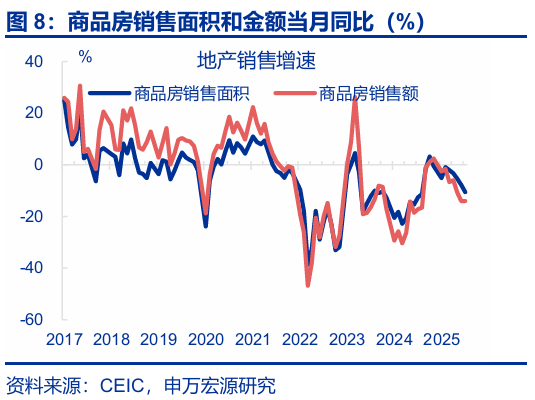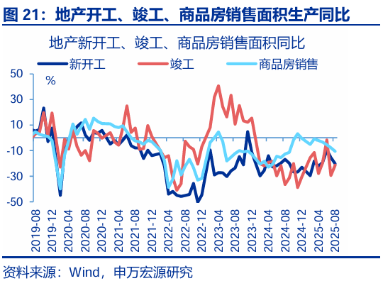 地产投资进一步下行,新开工、竣工面积延续低位。8月,房地产开发投资延续回落,累计同比较前月下行0.9pct至-12.9%,当月同比较前月下滑2.4pct至-19.4%。分不同阶段看,新开工、竣工面积延续低位,当月同比分别较前月回落4.8pct至-20.3%、上行8pct至-21.4%;同时商品房销售面积亦有回落,当月同比下滑2.7pct至-10.6%。
