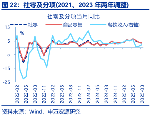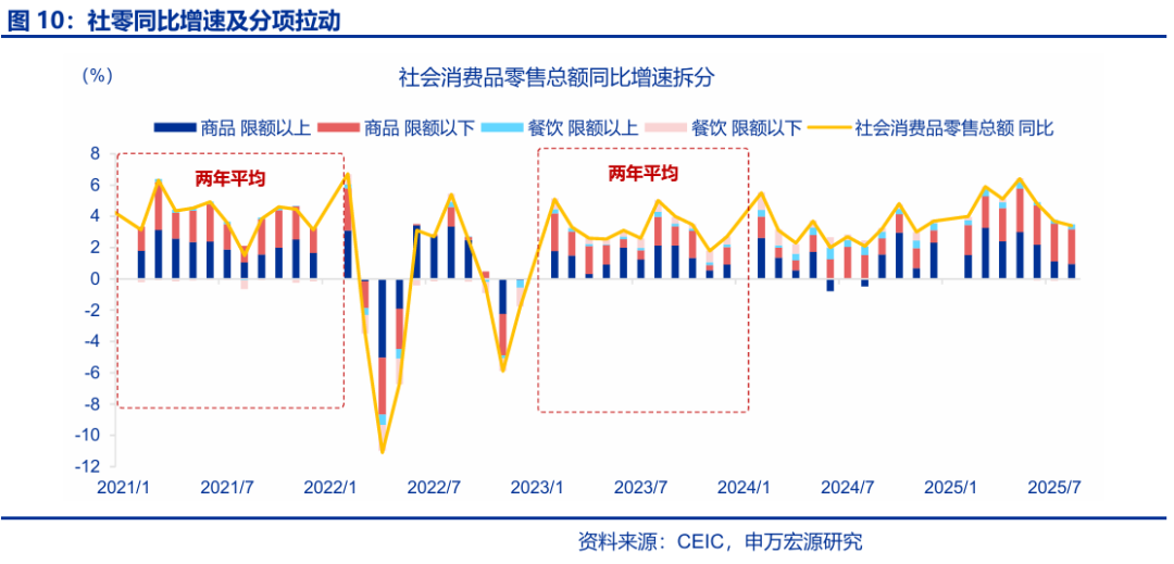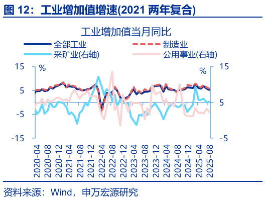 生产:上游生产持续向好,但“反内卷”对中下游生产的影响开始显现。8月,工业增加值当月同比回落0.5pct至5.2%。拆分结构看,上游生产表现较强,主因供给收缩的预期提振价格,使部分行业盈利与生产边际改善,如有色压延(+2.3pct至9.1%)、非金属矿物(+1.1pct至0.5%)、煤炭采选(+0.9pct至5.1%)等;本轮“反内卷”更聚焦中下游,8月运输设备(-1.7pct至12%)、金属制品(-1.4pct至2.8%)、下游中酒饮料茶(-2.5pct至-2.4%)、食品(-1.8pct至2%)均有所下行;黑色压延(-1.3pct至7.3%)、橡胶塑料(-1.3pct至3.5%)回落则更多反应投资明显走弱的影响。
