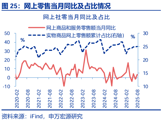 消费:部分“以旧换新”商品“退坡”特征显现,服务消费相对平稳。虽8月份最新一批国补资金下达,但家电(-14.4pct至14.3%)和通信器材(-7.6pct至7.3%)仍出现高位回落迹象;粮油食品等必需品也出现明显回落。服务消费方面,餐饮收入(+1.0pct至2.1%)小幅提振,1-8月服务零售额累计同比小幅下滑0.1个百分点至5.1%。