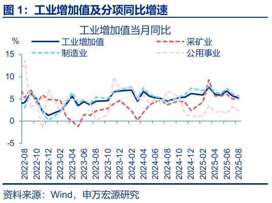 生产:工业生产走弱,服务业生产维持高位。8月,工业增加值当月同比较7月下行0.5pct至5.2%。其中制造业、公用事业生产增速回落,当月同比分别回落0.5pct至5.7%、回落0.9pct至2.4%,采矿业(+0.1pct至5.1%)则有回升。此外,服务业生产小幅回落,8月服务业生产指数当月同比较7月下行0.2pct至5.6%。