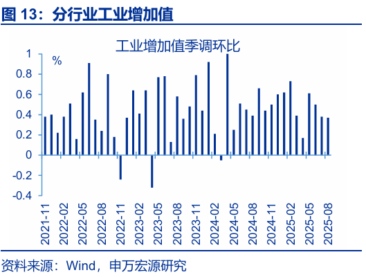 生产:上游生产持续向好,但“反内卷”对中下游生产的影响开始显现。8月,工业增加值当月同比回落0.5pct至5.2%。拆分结构看,上游生产表现较强,譬如煤炭开采等;本轮“反内卷”更聚焦中下游,8月运输设备(-1.7pct至12%)、金属制品(-1.4pct至2.8%)、下游中酒饮料茶(-2.5pct至-2.4%)、食品(-1.8pct至2%)生产均有所下行。