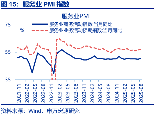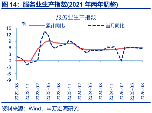 生产:工业生产走弱,服务业生产维持高位。8月,工业增加值当月同比较7月下行0.5pct至5.2%,其中制造业生产降幅较大。服务业生产指数当月同比下行0.2pct至5.6%。