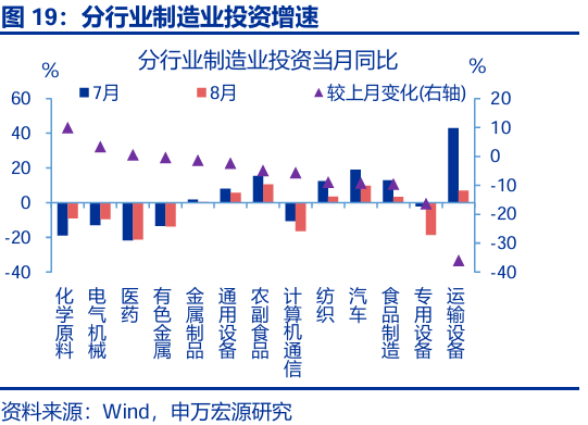 制造业投资降至四年来最低水平,装备制造业投资降幅显著。8月,制造业投资明显回落,累计同比较上月下行1.1个百分点至5.1%;当月同比较上月回落0.9个百分点至-1.2%。分行业看,运输设备、专用设备、汽车等行业投资增速降幅较大,分别较前月回落36、16.4、9.2个百分点至7%、-18.6%、9.7%;相比之下,化学原料、电气机械等行业投资增速涨幅较大,分别较前月上行9.9、3.4个百分点至-9%、-9.5%。