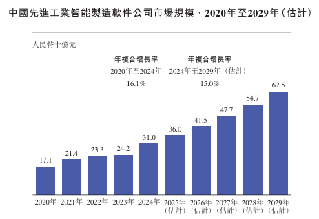 根据灼识谘询的资料,中国先进工业智能制造软件公司的市场规模从2020年的人民币171亿元增长至2024年的人民币310亿元,年复合增长率为16.1%,并预计将在2029年达到人民币625亿元,年复合增长率为15.0%。