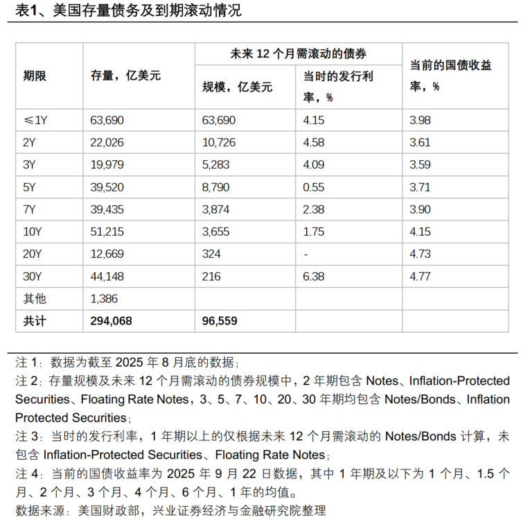 一是需压低短端利率。根据美国财政部数据,除未明确到期时间的非可交易国债(截至2025年8月存量约7.9万亿美元)外,可交易国债存量为29.4万亿美元,其中9.7万亿美元将在未来12个月内到期续发。在这9.7万亿美元中,1年期及以下的短期国债规模达6.4万亿美元,占比约66%,其利率水平对短端政策利率高度敏感,压低短端利率可直接减少短期国债的利息支出。