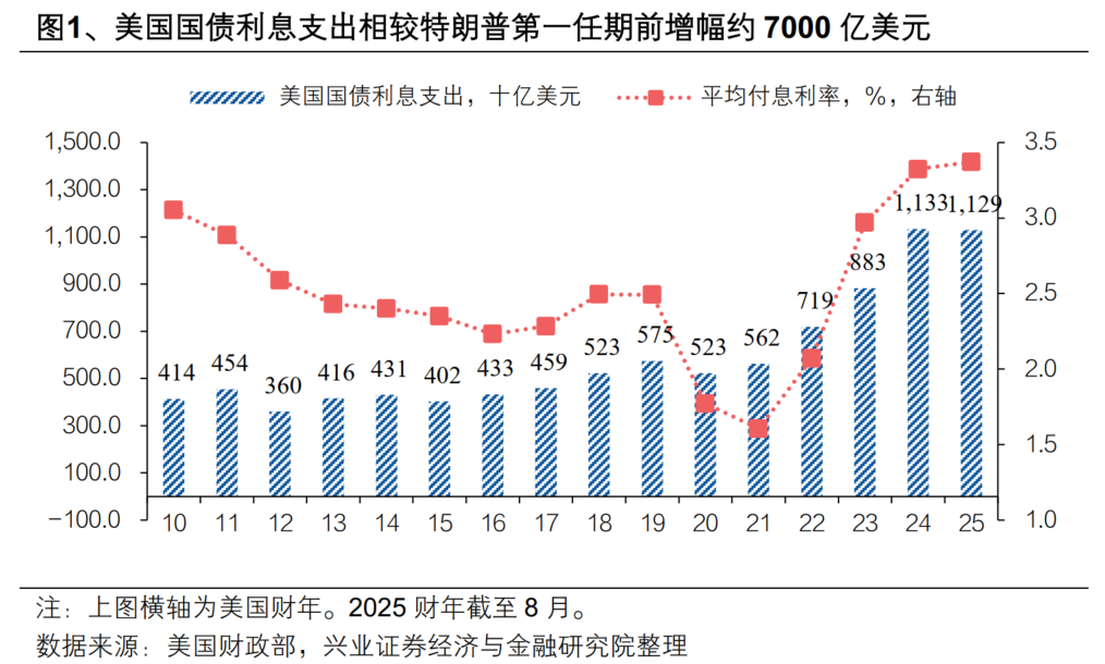 特朗普力促美联储降息的核心诉求在于降低财政负担。在本轮联储降息前,特朗普政府与美联储的关系有所恶化,二者分歧的本质是货币政策“为谁服务”的问题。美联储政策的制定锚定经济增长与通胀,而特朗普政府的核心诉求在于降低财政负担。对比特朗普的第一任期前(2016财年),美国财政利息支出为4326亿美元,而2024财年已突破1.13万亿美元,2025财年截至8月也已接近1.13万亿美元,较第一任期前的水平增加约7000亿美元。