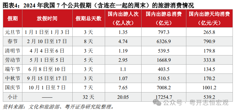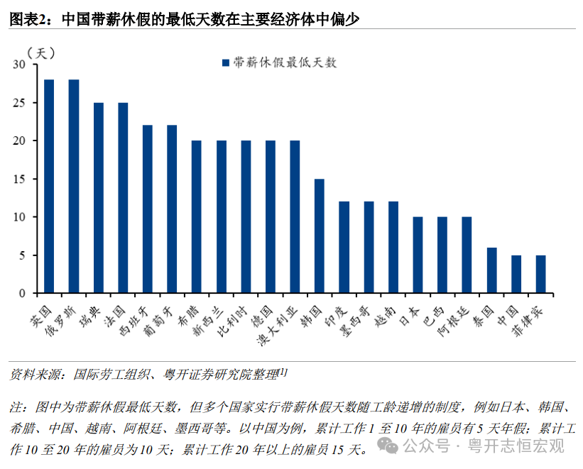 增加假期、减少劳动时间首要解决的问题是这是否会导致生产减少从而导致经济下行和增加企业成本,如何平衡企业和劳动者利益关系。客观上看,增加居民闲暇时间、减少劳动时间确实对生产会有局部扰动,但是当前我国经济面临的问题不是生产不足,而是需求不足,是供给大于需求导致的物价持续下行和企业盈利压力。当前我国经济已经从“供给短缺”阶段转向“需求不足”阶段,继续抓着生产不放,持续增加劳动量投入,只会加重“内卷式”竞争问题,导致阶段性产能过剩,物价持续低迷,加剧供需矛盾。此时,只有增加居民的收入和闲暇,才能激活更多消费场景来消化庞大的产能,才能推动经济进入新的良性循环。增加闲暇时间能够带动消费尤其是服务消费增长,加快供需再平衡。当前,我国消费结构从商品消费向服务消费升级的趋势愈发明显,服务消费占总消费支出的比重从2013年的39.7%上升到2023年的45.2%。然而与主要发达国家比较,我国服务消费水平仍有差距,2023年美国服务消费占比为66%,日本、法国、英国均接近60%,德国为50%(详见《如何发展服务消费?中国服务消费的现状、问题与建议》)。服务消费的特点是“耗时性”,与商品消费的“瞬时性”截然不同,看一场电影必须消耗2-3小时,短途旅游必须花费2-3天时间,养老育幼、医疗健康等服务消费都与时间挂钩。2024年我国公共假期(含连在一起的周末)在内共32天,日均国内出游消费约539.2亿元;而其余的334天,日均国内出游消费约120.5亿元,节假日国内旅游消费高出普通日期约418.7亿元/天。事实上,增加的闲暇时间并不会被虚度,而是流向了短途旅游、夜间市集、老年兴趣学堂等,这些被带动起来的消费场景又能创造成百上千的就业岗位,并反哺生产。随着经济发展阶段的转变,闲暇对生产的“替代效应”正逐步被闲暇增长带来的其他正向效应取代并超越,闲暇对劳动者素质的提升、对消费的刺激、对生产的反哺、对经济增长的拉动效果越来越强。2、增加居民闲暇时间,有利于提高劳动效率,促进科技创新闲暇增加可以提高劳动效率。闲暇时间可以用来缓解压力、恢复体力,使劳动者有更充沛的精力、更饱满的状态投入到工作中,进而提高全社会劳动生产效率。早在1986年,中华人民共和国国家科学技术委员会(科技部的前身)就成立了“缩短工时课题组”,研究分析我国实施五天工作制(即双休制)的可行性。当时,课题组对北京、上海等多个城市的企业进行了典型调查和案例分析,其研究结论显示,缩短工时后,这些企业的生产效率不降反升。例如,北京密云机床研究所从1983年开始缩短工时,1985年实现了五天工作制。在此期间,工时投入量减少了20%,产值翻了两番,人均劳动生产率提高了近5倍。而过长的工作时间,挤占了劳动者原本用于培养兴趣、锻炼身体、放松身心的时间,降低了劳动者生活质量,使劳动者失去热情和动力,陷入“躺平”“佛系”等消极状态,反而对劳动生产率产生不利影响。2000年到2010年间,日本加班文化盛行,劳动者工作时间普遍较长,缺乏闲暇时间。根据日本厚生劳动省数据,期间因过度劳累引发精神疾病的劳动者多达1855人,而日本劳动生产率(每个劳动者单位时间产出)增速却从6.1%降至4.2%[5]。闲暇增加有利于促进科技创新。现代经济学研究发现,闲暇能产生“闲中学”效应,可以提高个体认知水平,加速人力资本积累,并推动整个社会创新能力的提升[6]。事实上,很多耳熟能详的创新发明都发生在闲暇时间里。增加居民闲暇时间对经济增长的正向作用,被无数历史实践所证实。许多发达经济体都曾把增加闲暇时间、优化休息休假制度作为应对外部冲击、推动国内消费的手段。例如,为了应对1970年以来经济持续放缓的问题,法国政府在1981-1983年期间采取了一系列措施。除了最低工资提高10%,提高家庭津贴和住房补贴10%至25%之外,很重要的举措就是缩短每周工作时间到39小时,以及延长带薪年休假为5周,这一规定一直适用至今[7]。再如,日本为了提高劳动生产率,也为了平抑社会对“过劳死”现象频发的不满,于2016年提出“工作风格改革”,开始系统性调整劳资关系,完善休息休假制度。2016年日本设立“山之日”,让法定假日增至16天;2018年日本实施《工作方式改革法案》,规定每月加班时间上限为100小时,同时提高带薪年假的强制性,员工至少每年休5天带薪年假,违反规定的企业将遭受高达3000万日元的罚款。事后看,日本增加劳动者闲暇时间并未对经济产生拖累,2017年、2018年实际GDP增速分别为1.7%和0.6%,持平甚至好于改革前的2014年(0.3%)、2015年(1.6%)。当前,内卷式竞争已从个体努力演变为群体性生存焦虑,折射在劳动力市场上,表现为无效加班普遍存在、工作时间不断拉长、闲暇时间稀缺。随着这种社会氛围不断蔓延,年轻人的生活方式、处世哲学和行为逻辑都受到冲击,并对生育、人口等长期变量产生影响。过长的工作时间会降低劳动者的生育能力和生育意愿;同时闲暇时间的匮乏意味着劳动者没有足够时间进行家庭照料、亲子交流。三、增加居民闲暇时间、完善我国休息休假制度的政策建议我们建议增加居民闲暇时间、完善休息休假制度可以从四个维度入手。一是增加总量,在下半年增设七夕节、重阳节假期,推动公共假期分布均衡化。二是提升体验,优化调休规则,减少连续补班带来的负面影响