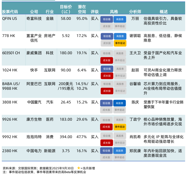 金吾财讯 | 交银国际发布十月金股严选。 9月港股延续震荡上行态势,在中美谈判重启和海外降息预期双重利好助推下,叠加科技板块轮动上涨,对大盘形成重要提振。外部环境延续向好,中美贸易谈判重启,市场对双边关系进展预期有所升温。与此同时,中国内地宏观政策保持连续性和稳定性。海外降息重启,中国香港流动性压力缓解,南向资金延续加速涌入。8月下旬港股流动性一度收紧,但随着美联储降息落地,港元利率中枢高位下行。南向资金9月延续加速流入趋势,续创历史新高。科技叙事驱动下,海内外算力投入持续增长,预计中国内地投资者对港股AI等优质标的的配置需求依然旺盛。
