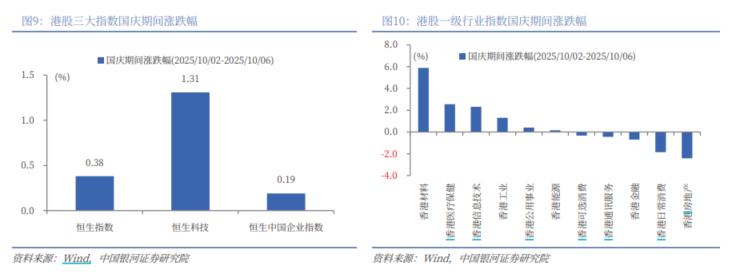 国庆期间(10月2日至6日),港股市场展现出较强韧性。据银河证券统计数据显示,恒生指数期间累计上涨0.38%,恒生科技指数凭借产业热度带动,涨幅达1.31%,恒生中国企业指数亦微涨0.19%,三大指数均实现正向收益。