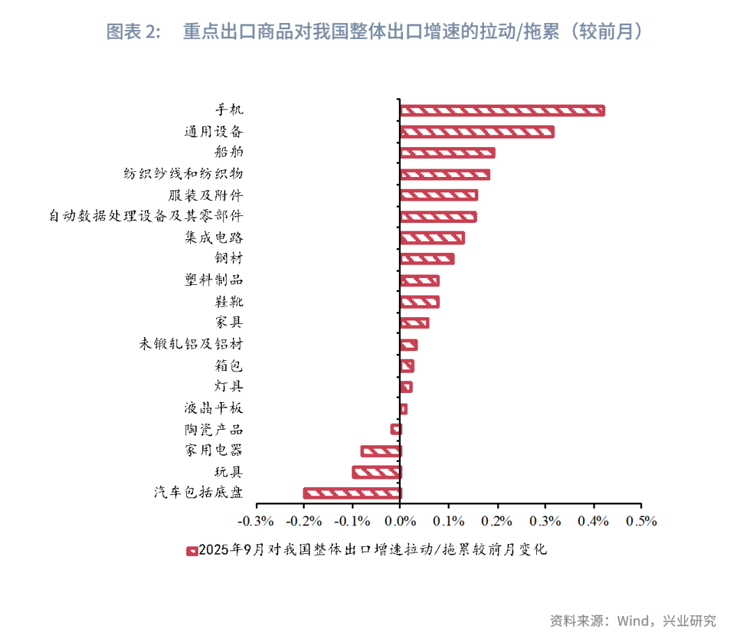 在出口方面,9月我国对非洲、拉美、欧盟出口提升较为明显,同时对美出口降幅亦有所收窄。值得一提的是,9月我国对非洲出口单月金额再创新高,9月非洲对我国整体出口增速的拉动作用为2.7个百分点,超越了东盟的2.4个百分点,成为9月拉动我国出口最多的地区。今年以来,我国对非洲的出口持续保持高增,非洲已经成为拉动我国出口增长的重要一极。2025年1-8月,我国对非洲出口增速较高的主要经济体为尼日利亚、利比里亚、坦桑尼亚、几内亚、科特迪瓦,出口同比分别为37.5%、58.5%、32.0%、75.4%、55.4%。1-8月对非洲出口增长最快的主要产品为机械产品、车辆及其零件、船舶、钢铁制品、钢铁,出口金额同比分别为32.1%、59.6%、80.1%、22.5%、33.6%。
