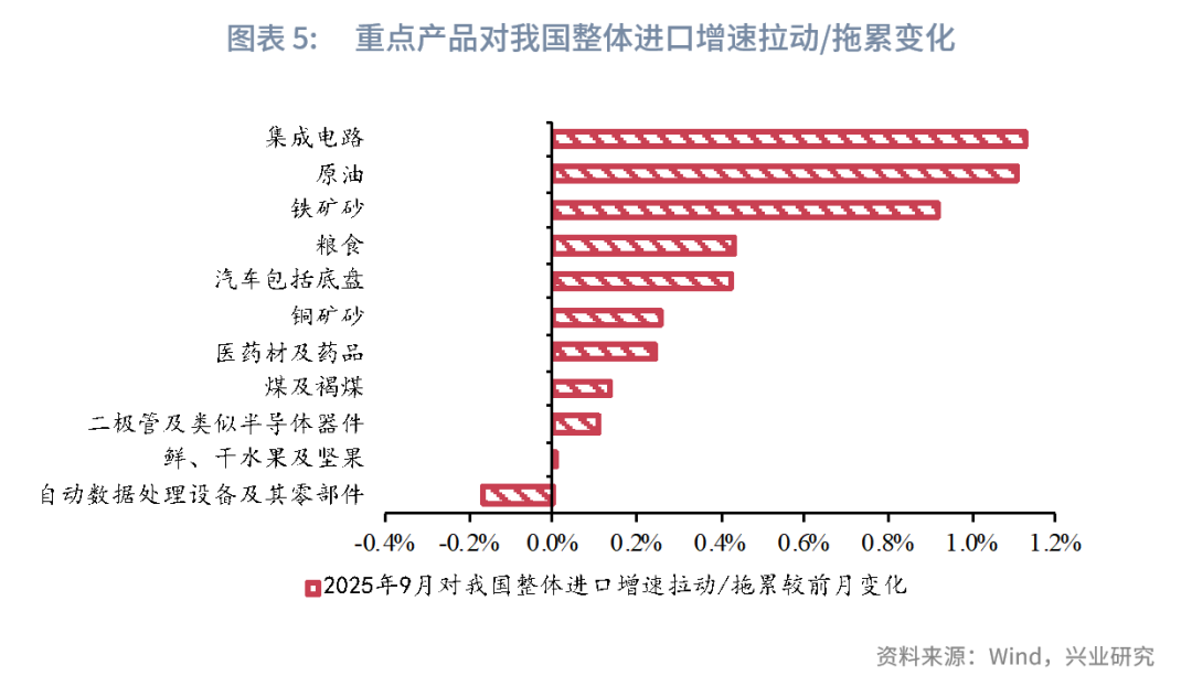 除集成电路外,大宗商品的进口回升也对进口同比形成支撑。9月原油进口降幅收窄至7.4%,对整体进口的拖累较上月收窄1.1个百分点。铁矿砂进口同比转正,拉动整体进口同比提升0.6个百分点。