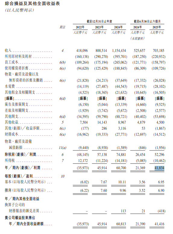 2022年-2024年,及2025年截至6月30日止六个月,录得亏损3597.3万元、盈利4591.4万元、盈利6070万元、盈利4183.4万元,其中今年上半年利润实现同比翻倍。