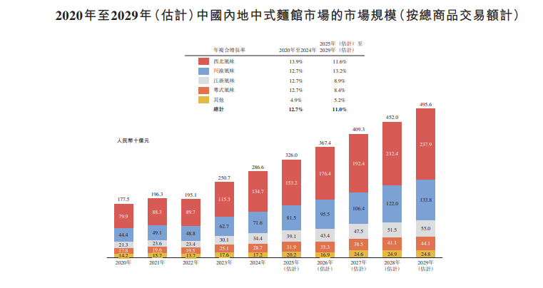 在中式面馆市场中,中国以川渝风味为主的中式面馆市场的总商品交易额从2020年的人民币450亿元扩张至2024年的人民币727亿元,年复合增长率为12.8%,预期2029年的总商品交易额将达至人民币1,357亿元,2025年至2029年的年复合增长率为13.2%。