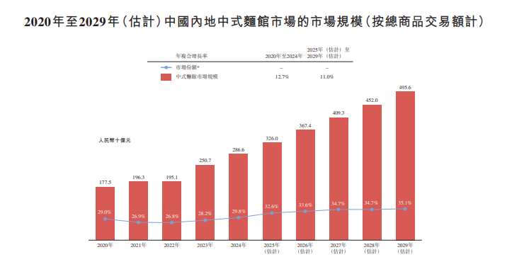 中国中式面馆市场(包括中国内地、香港特别行政区、澳门特别行政区及台湾省)的总商品交易额由2020年的人民币1,833亿元增长至2024年的人民币2,962亿元,年复合增长率为12.7%。展望未来,基于中国城市化进程的推进、可支配收入的增长及外出就餐消费者比例的增加,中式面馆市场预期将进一步加速增长,到2029年,总商品交易额将达至人民币5,100亿元,2025年至2029年的年复合增长率为10.9%。