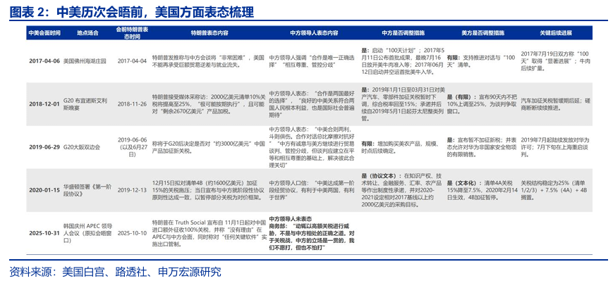 会晤前释放强硬表态是特朗普惯用战术策略、旨在增加谈判筹码。历史上有四次中美元首会晤的案例,分别是2017年4月海湖庄园会晤、2018年G20会晤,2019年G20会晤,2020年一阶段协议达成。2018年12月1日,中美于布宜诺斯艾利斯举行G20会晤,特朗普于11月26日表态称极可能将2000亿清单关税由10%调至25%,威胁对剩余2670亿美元产品加税。会晤后,中方下调对美汽车关税,增加农产品采购,美国方面则暂停关税上调。特朗普一般在会前1至2周释放强硬信号,迫使谈判对手做出调整,但今年中方的应对策略与1.0并不相同。