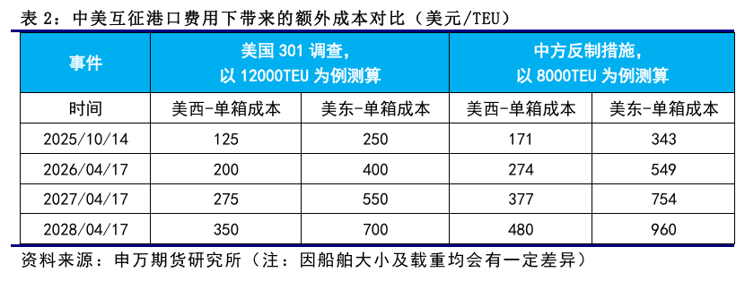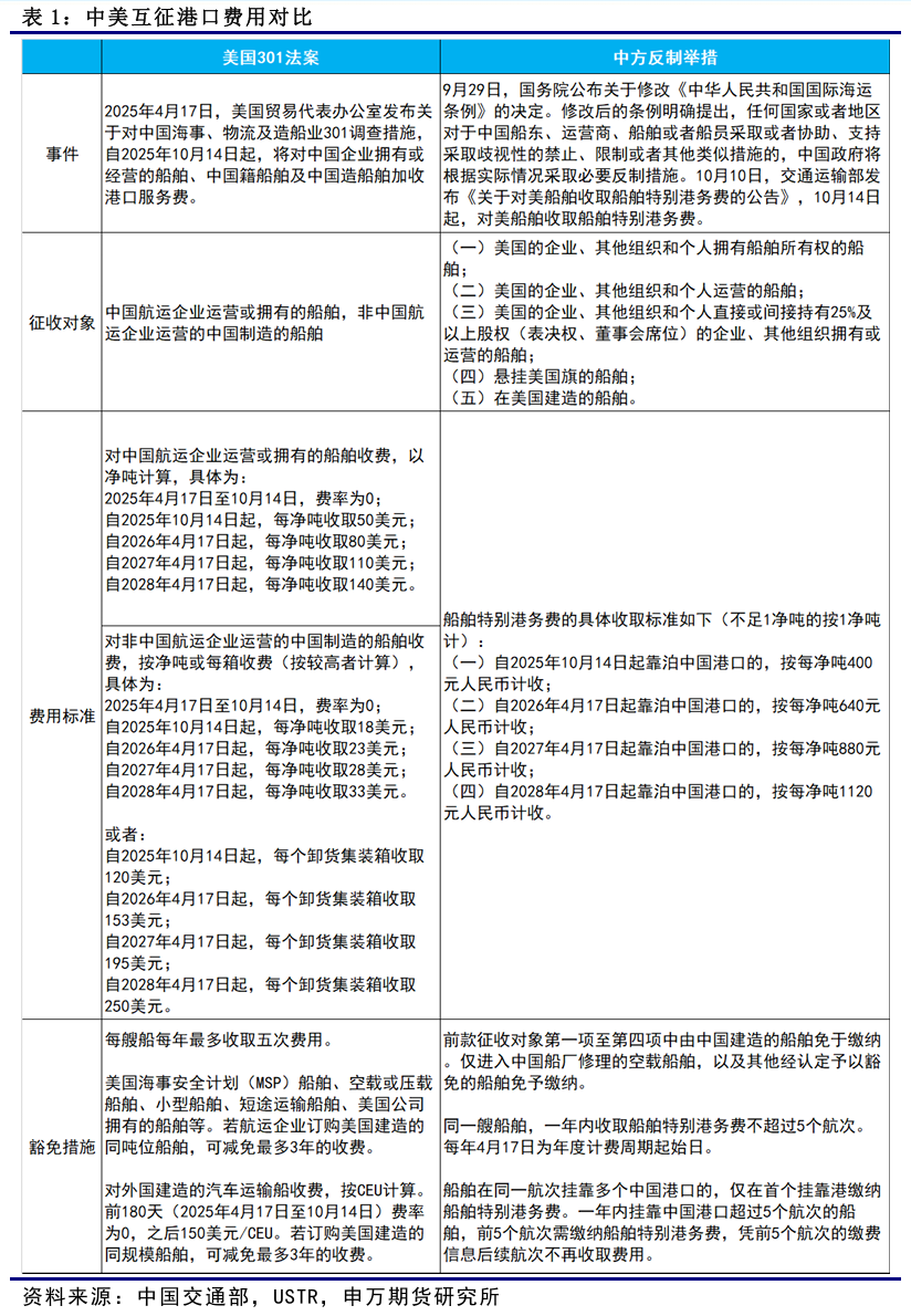事件:9月29日,国务院公布关于修改《中华人民共和国国际海运条例》的决定。10月10日,交通运输部发布《关于对美船舶收取船舶特别港务费的公告》,10月14日起,对美船舶收取船舶特别港务费。此次主要是对今年4月美国公布的对中国海事、物流及造船业301调查措施的反制措施。征收对象:自2025年10月14日起,对美国的企业、其他组织和个人拥有船舶所有权的船舶;美国的企业、其他组织和个人运营的船舶;美国的企业、其他组织和个人直接或间接持有25%及以上股权(表决权、董事会席位)的企业、其他组织拥有或运营的船舶;悬挂美国旗的船舶;在美国建造的船舶,由船舶挂靠港口所在地海事管理机构负责收取船舶特别港务费。费用标准:特别港务费的收取分阶段实施,(一)自2025年10月14日起靠泊中国港口的,按每净吨400元人民币计收;(二)自2026年4月17日起靠泊中国港口的,按每净吨640元人民币计收;(三)自2027年4月17日起靠泊中国港口的,按每净吨880元人民币计收;(四)自2028年4月17日起靠泊中国港口的,按每净吨1120元人民币计收。对集运的影响:中美互征港口费用对集装箱海运的主要影响在于运价和航线网络重构。首先在运价方面,目前大部分头部船公司均公告不会额外征收附加费,尤其对于COSCO和OOCL可能面临的价格挑战会更大一些,但中远集运也发布公告仍会坚持投入稳定运力,保持稳定的服务品质,确保费率及附加费和市场水平保持一致。从具体增加的费用来看,以中国前往美国12000TEU的集装箱船和美国前往中国8000TEU的集装箱船测算,中国反制措施所带来的额外成本基本和“301调查”对中国船企带来的额外成本基本一致。在航线网络重构方面,成本结构变化重塑了不同船公司在跨太平洋航线上的竞争力,船公司进行船舶置换、调整挂港顺序,甚至开辟经第三国(如越南、马来西亚)的“迂回”航线,熟悉的直达航线被打乱,可能导致运输时间延长、供应链计划更复杂。对其他商品的影响:此次事件预计将通过成本抬升、运力重构和贸易流转向三大路径影响商品市场。其影响在板块和品种间存在显著分化,除了集运以外,预计对能源及部分进口依赖型商品受到的冲击最为直接。全球约15%的油轮由美上市公司运营或拥有,反制措施导致这些船只面临高额港务费,促使租家规避美资船,有效运力下降,推升运价。一艘VLCC单次靠港费约4200万元,相当于中东-中国航线日租金增加超13万美元。黑色板块铁矿石运输成本上升将推高到岸价,可能引发期货价格短期支撑较强,但煤炭和下游钢铁行业国内定价为主,受进口成本冲击较小,生产利润大概率承压。新能源产业链来看,锂电池、光伏组件等出口导向型商品,主要依赖中欧班列及东南亚航线,受中美航运政策直接影响有限。风险提示:政策出现超预期变化,实际集装箱船载重偏差。