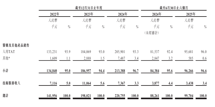 其一,收入过于依赖单一产品。招股书显示,于2022年、2023年及2024年,人用TAT的销售收入分别为1.33亿元(人民币,下同)、1.84亿元及2.06亿元,分别占同期总收入的93.9%、93.0%及93.3%。为此,公司开始尝试逐渐降低对单一产品的依赖性,如开发蛇咬伤抗毒血清及马狂犬病免疫球蛋白F(ab’)2等。
