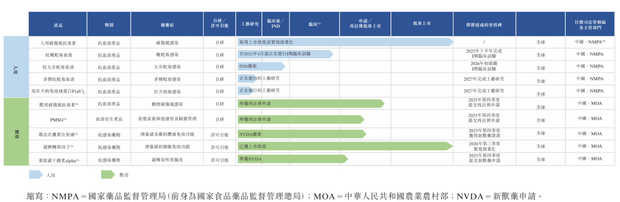 公司已建立人用药和兽药的协同产品组合。除人用TAT外,公司的现有产品包括兽用破伤风抗毒素、孕马血清促性腺激素(“PMSG”)以及若干用于补充或支持PMSG治疗的激素类药物,这些产品将在完成上市批准的重新注册后投放市场。公司还建立了针对不同市场分部的多样化产品管线,包括丰富的人用抗蛇毒血清、马狂犬病免疫球蛋白F(ab’)2及多种兽用抗感染药物。
