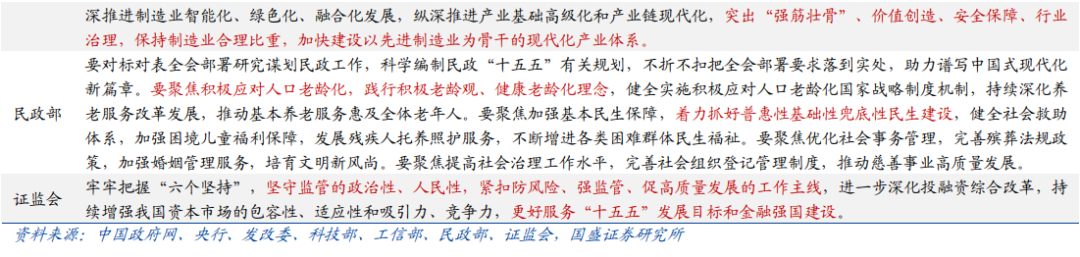 >增量6:特别提及“促进人口高质量发展”“一老一小”,继续优化生育支持政策,挖掘养老服务、银发经济潜力。其中,生育支持政策方面,“发挥育儿补贴、个税抵扣等政策的综合作用,发展普惠托育和托幼一体化服务,完善落实生育保险和生育休假制度”等;养老服务方面,“优化基本养老服务供给”,特别关注“优化就业、社保等方面的年龄限制政策,积极开发老年人力资源,发展银发经济”等。