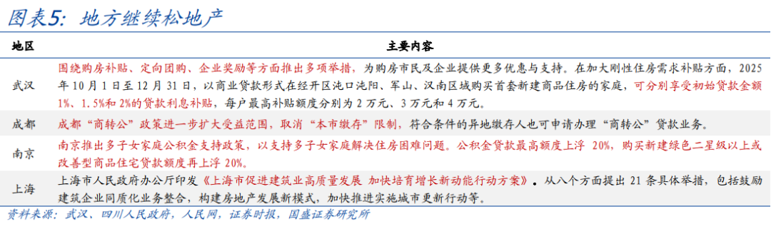 1、近期地方继续松地产,仍多围绕购房补贴、优化公积金贷款支持政策。其中,围绕购房补贴、定向团购、企业奖励、贷款利息贴息等方面推出多项举措;成都“商转公”政策进一步扩大受益范围,取消“本市缴存”限制;南京推出多子女家庭公积金支持政策等。