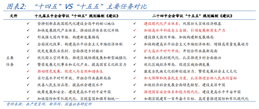 >总体看,会议公报可视为“十五五”规划编制《建议》稿的摘要版,主要是大方向、大原则、主要目标和主要任务,对比十九届五中全会定调“十四五”,新提“航天强国”,2035远景目标新增“国防实力、国际影响力大幅跃升”,延续强调到2035年翻番的目标,未来5年应还会设定偏高的GDP目标(2026年可能定5%左右)。