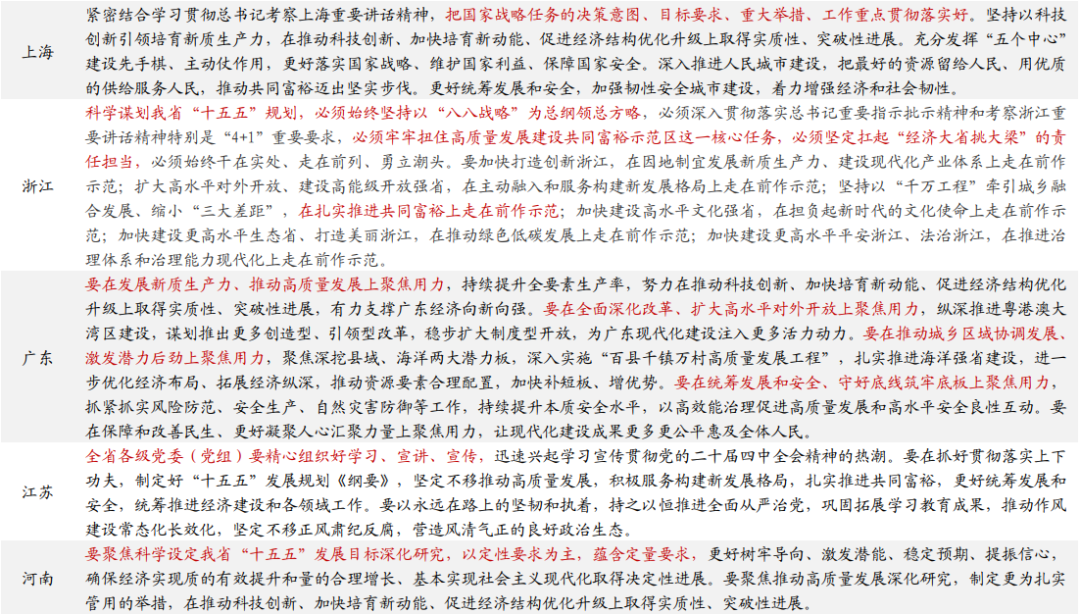 近期北京、上海、浙江等地学习传达四中全会精神,首要是抓好宣传、宣讲、落实,也强调因地制宜。其中,多地强调对标对表、科学谋划本地区“十五五”规划,突出核心任务,如浙江强调“必须牢牢扭住高质量发展建设共同富裕示范区这一核心任务”,北京“纵深推进京津冀协同发展,加快构建现代化首都都市圈”,广东深入实施“百县千镇万村高质量发展工程”等;此外,各地也多部署年内经济工作,坚决完成全年经济社会发展目标,如内蒙古“拿出更大劲头大抓招商、大抓项目、大抓投资”。