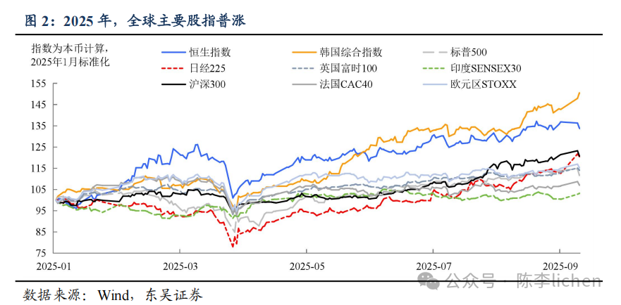 2025年至今,主要股票市场指数均出现上涨,与此同时,主要经济体的债券利率下降(即债券面值上涨)。黄金和加密货币的价格上涨,更是令人印象深刻。全球股市的上涨,尤其是是欧洲和日本的股市上涨,固然欧洲经济有预期改善、日本经济有复苏上升的因素支撑,为企业盈利改善提供了关键的宏观叙事,但这些因素不足以完全解释。