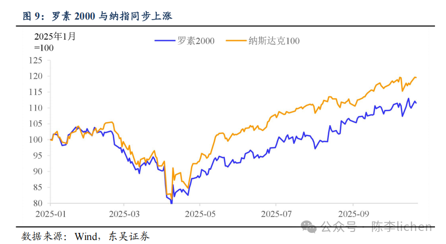 虽然人工智能板块表现突出,但仔细观察会发现,金融、消费、房地产等传统行业的股票同样在上涨。代表中小企业的罗素 2000 指数与科技股集中的纳斯达克 100 指数同步上扬,这说明当前的行情不是某个特定产业驱动的,而是整体性的资金流入。