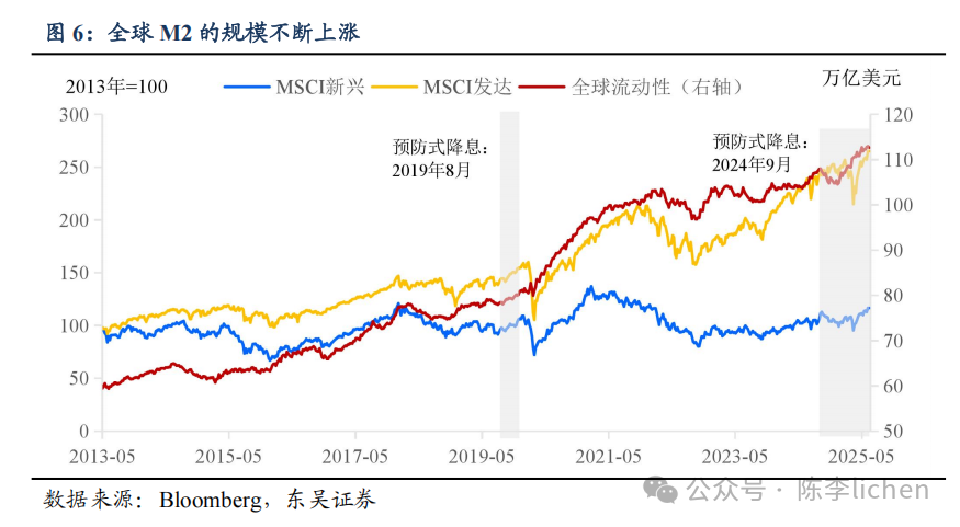 资产价格不断上涨,但是 2025 年全球流动性的边际增量并没有明显超过 2024 年。通过数据发现,全球 M2 规模在不断上涨,货币供应持续增加,截至 2025 年 7 月,全球 M2 升至113 万亿美元,但从边际增速来看,增幅整体平稳并未明显超过 2024 年的水平。
