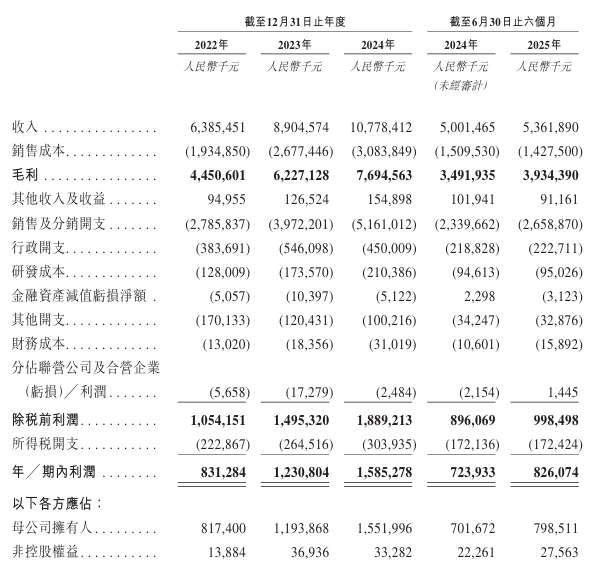 2022-2024年,公司分别录得收入63.85亿元、89.05亿元及107.78亿元;2025年上半年收入同比增长7.21%至53.62亿元。