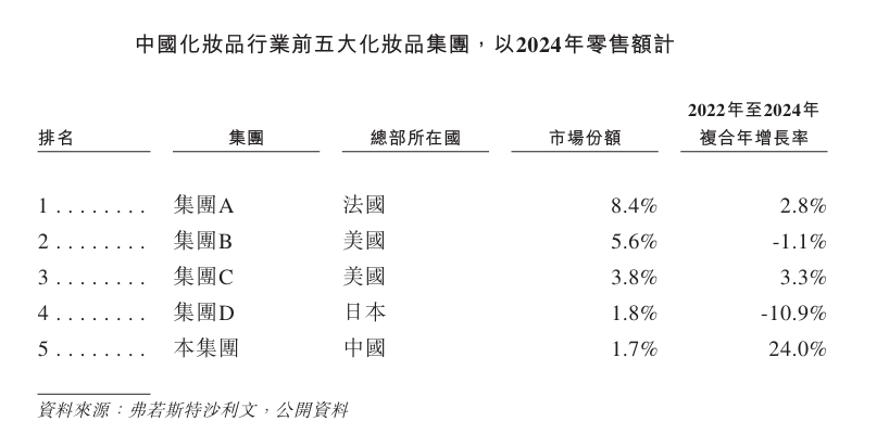 根据弗若斯特沙利文的资料,以2024年零售额计,公司是中国第五大化妆品集团,亦是前五名中唯一的国货集团。