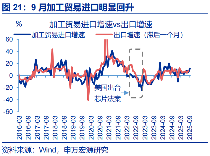出口:10月中美关税再生波折,“抢出口”或对10月出口形成支撑。10月10日美国威胁自11月起对中国所有商品加征100%关税,关税政策加码预期或再度引发对美“抢出口”。考虑到企业发货到报关出口存在时滞,10月最后一周港口外贸货运量冲高(+18pct至20%),或反映“抢出口”现象。加之9月加工贸易进口同比回升(+6.6pct至12%),预计10月出口同比或仍有韧性(7%)。