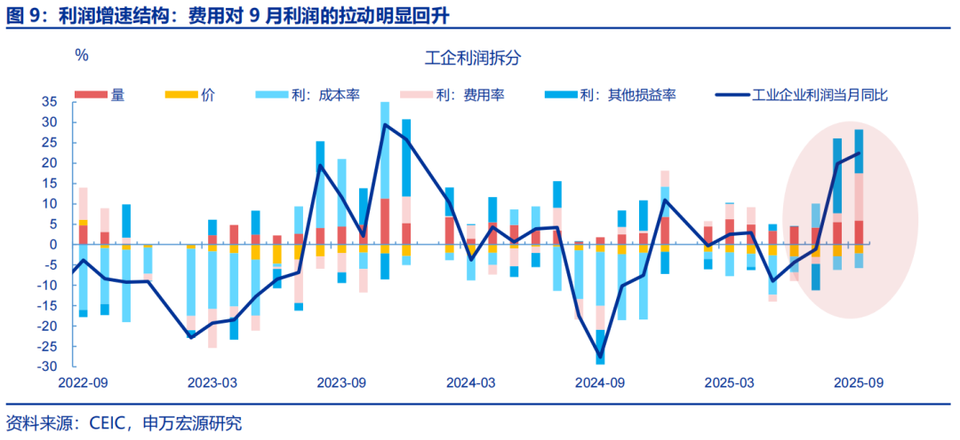 利润:9月剔除低基数因素后,工业企业利润弱于往年,且目前成本率仍处历史高位。低基数下,9月工业企业利润同比回升2.6pct至22.5%。但两年复合看,9月利润增速回落5.3pct至-5.9%;同时利润环比仅1.1%、明显弱于往年同期(11.3%)。从影响因素看,利润同比延续上行更多是费用率等短期指标对利润同比的拉动明显回升,边际上行9.5pct至11.6%。但影响利润增速的中长期因素,如成本压力仍在增加,9月整体成本率为85.4%、对利润同比的拉动较前月回落0.3pct至-3.6%。结构上,冶金链、消费链的成本率均在历史高位。因此,后续企业利润修复的持续性有待进一步跟踪。