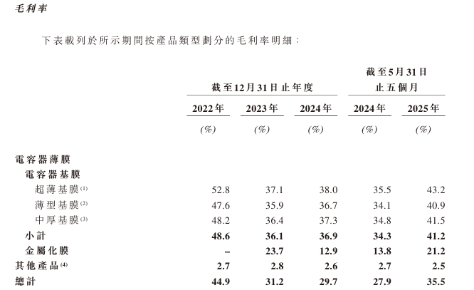 电容器基膜为公司收入的最大组成部分,于2022年、2023年及2024年以及截至2024年及2025年5月31日止五个月,分别占总收入的91.9%、71.8%、72.8%、71.7%及78.5%。