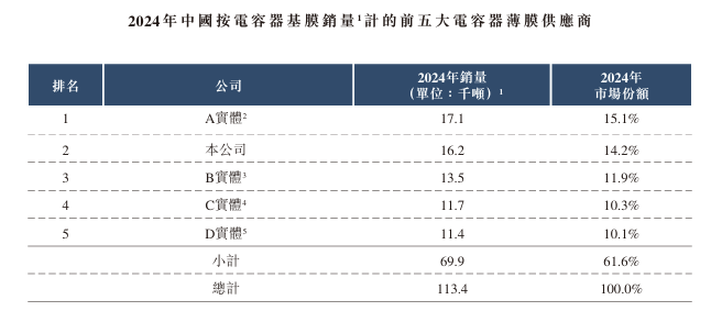 于2024年,按电容器基膜销量计,公司在中国电容器薄膜市场的市场份额为14.2%。尽管公司在中国电容器薄膜市场中排名第二。具体而言,于2024年,按电容器基膜销量计,在中国排名第三至第五的电容器薄膜供应商的市场份额分别为11.9%、10.3%及10.1%。