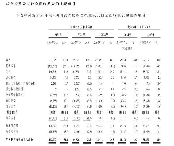 于2022-2024年度及2025年截至5月31日止五个月,公司收入分别为约3.27亿元、3.3亿元、4.22亿元及1.57亿元;对应同期,年内利润及全面收入总额分别为约1.02亿元、6982.6万元、8641.8万元及3135.9万元。