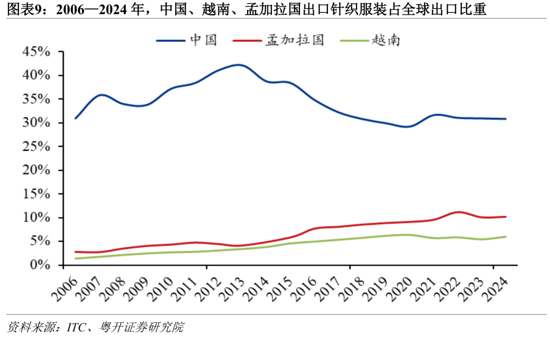 随着这些发展中经济体制造业能力提升和本地产业链逐步完善,其生产的部分消费品正逐步替代中国原有的市场份额。以纺织服装产业为例,中国针织服装出口占全球针织服装出口的比重从2013年峰值的42.0%下降11.2个百分点至2024年的30.8%,同期孟加拉国和越南的份额分别上升6个百分点和2.6个百分点。