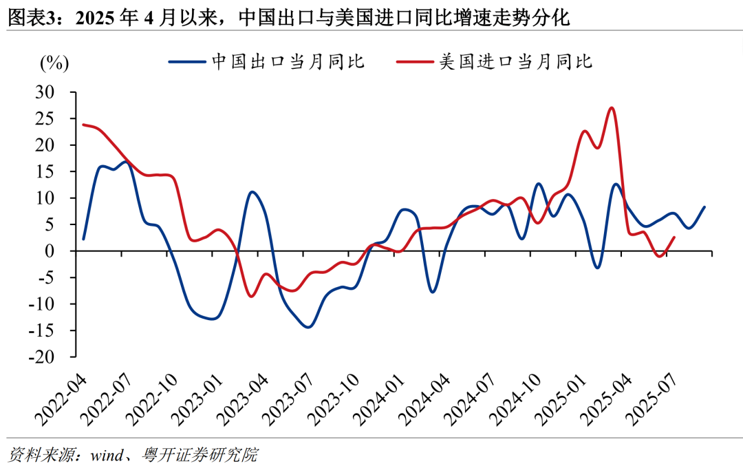 针对中国出口超预期的表现,此前有观点将其归因于上半年的“抢出口”“抢转口”效应,即企业为规避美国关税政策而提前发货,造成的阶段性出口冲高,但这种解释缺乏充分支撑。一方面,若出口高增主要由“抢出口”驱动,增长应集中在上半年,但4月以来美国进口同比增速便明显回落,6月更是由正转负,而中国出口在三季度仍维持较快增长。另一方面,出口高增的动能并非来自美国市场,也并未主要集中在以东盟为代表的转口贸易中枢,而是体现在对东盟、欧盟、非洲、拉美等多个市场的同步扩张。由此可见,中国出口的韧性不应被视为阶段性波动现象,而是由长期增长动力结构性重塑所驱动的。
